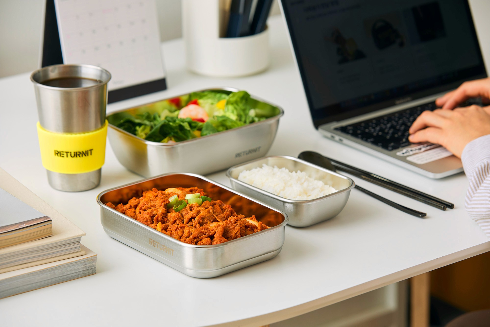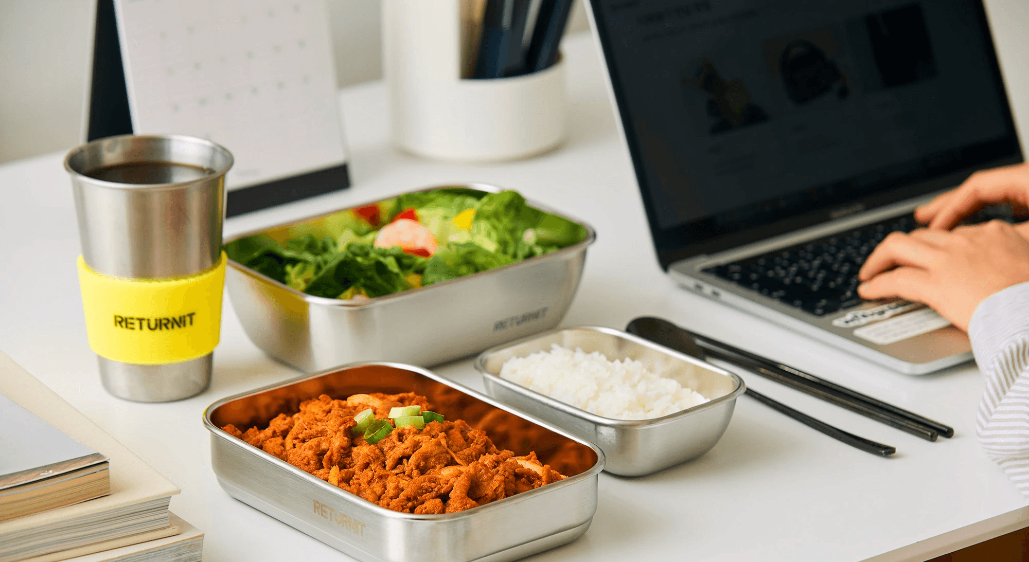 친환경 스테인리스 용기에 담긴 배달음식을 즐겨보세요