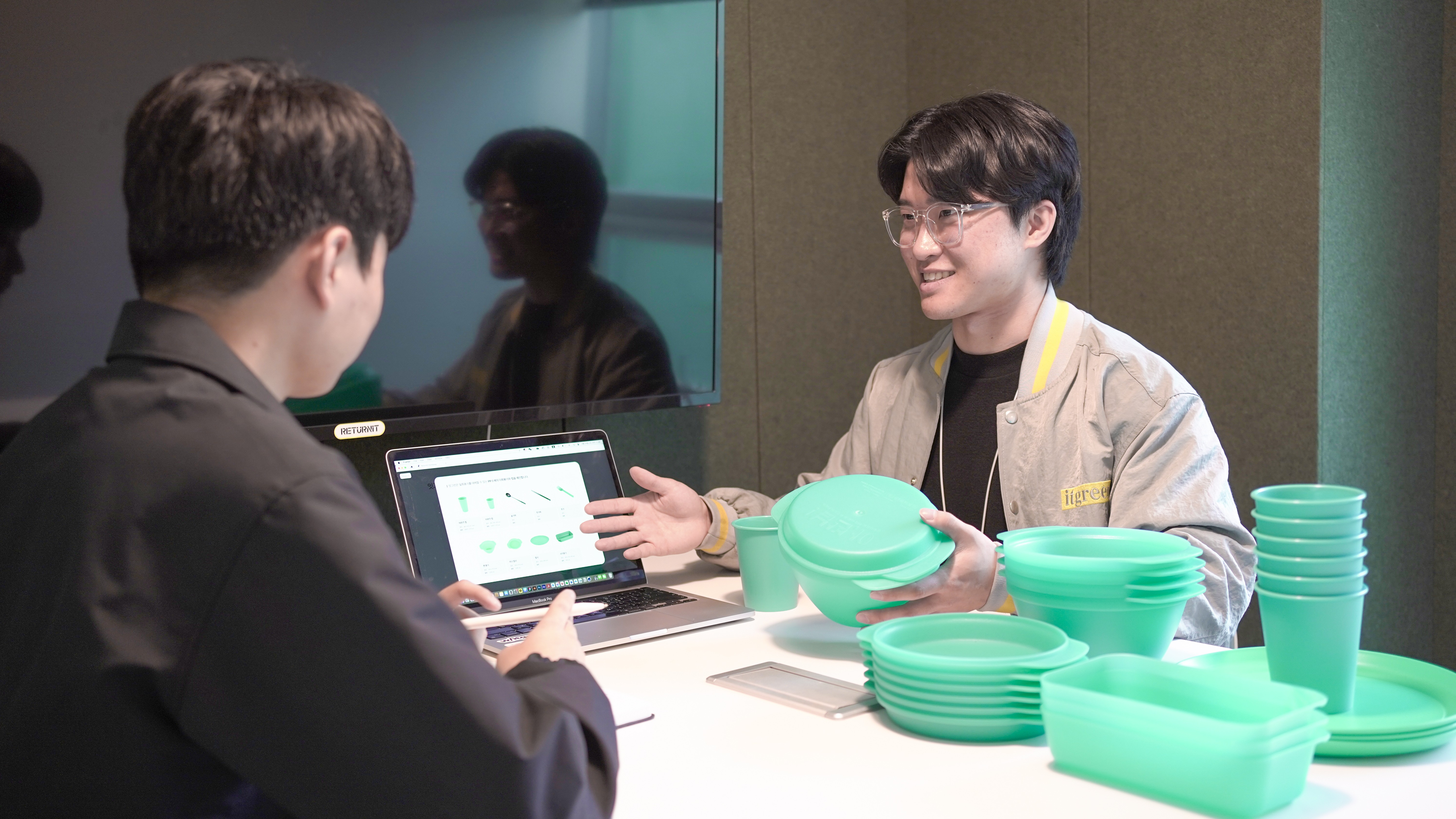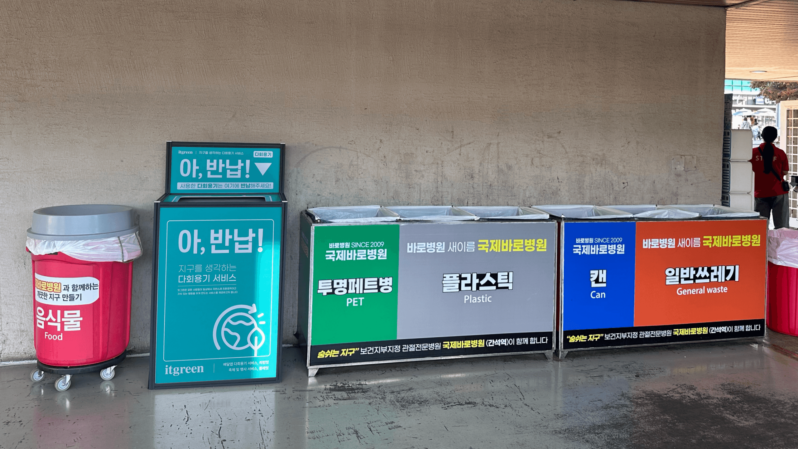 사용 후에는 출구마다 배치된 24개의 다회용기 전용 회수함에 반납하면 끝! 보다 쉽게 일회용기와의 구분을 위해 다회용기와 회수함은 민트색으로 통일하였어요.