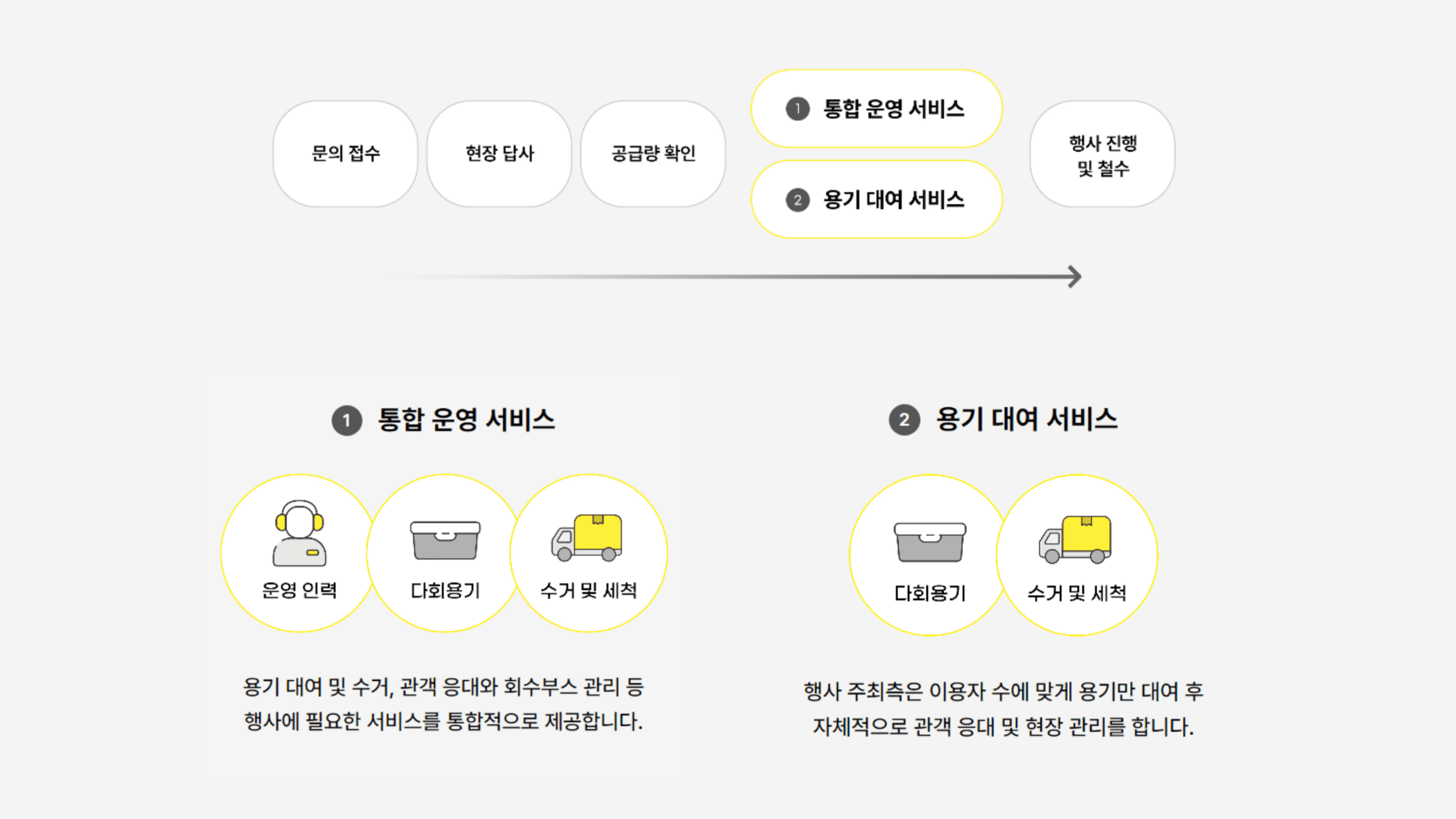 파악된 행사 데이터를 기준으로 다회용기 공급량을 예측하여 행사에 필요한 서비스를 크게 두 가지로 제안 드리고 있어요. 용기 대여 및 수거, 관객 응대와 회수 부스 관리 등 행사에 필요한 전반적인 부분을 잇그린에서 관리하는 '통합 운영 서비스'와, 관람객 이용 수에 맞는 다회용기만 대여해 주는 '용기 대여 서비스'가 있습니다. 야구장에서는 다회용기 대여부터 반납 안내 인력까지 제공하는 '통합 운영 서비스'를 이용 중이에요.